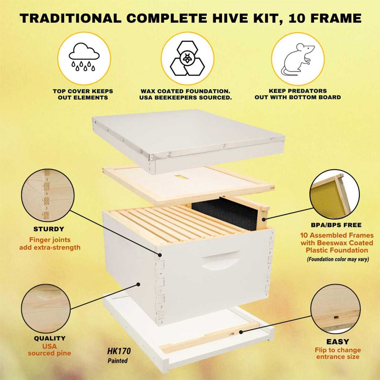 Start a new colony with our Traditional Complete Hive Kit. Once your bees draw out most of the foundation, you can add a second deep hive body. Don't forget a feeder to complete your kit! Made in the USA