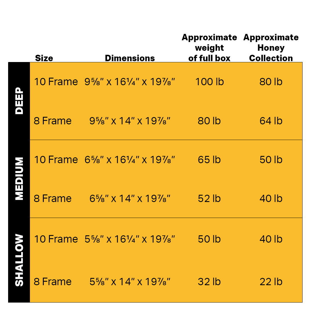 Did you know the only difference in measurements between 10-frame and 8-frame boxes is the width? 8-frame equipment is narrower than 10 frames, and not always compatible with other 8-frame equipment as dimensions vary slightly by manufacturers. 10 frame equipment offers more space for brood and honey production.