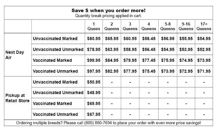 Queen orders are prepaid. Orders are subject to a $10 change or cancellation fee after the prepayment has been processed. By purchasing, you agree to our Bee Policy.
