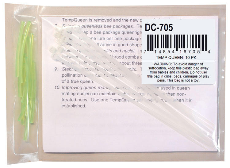 Improve Queen Rearing Success - TempQueen (simulates an egg laying queen) used in queen mating nuclei in early spring can maintain significantly higher bee numbers than in non-treated nucs. Insert one TempQueen lure in each mating nuclei when it is established or when the queen cell is inserted. Ship Queenless Packages - TempQueen calms bees shipped in queenless packages. Place TempQueen lure as if it were a queen cage. Temporary Queen Replacement - A hive will perform normally for several days with Temp Queen as a temporary queen. Remove the queen or queen cells and place a TempQueen lure in each brood box. When a queen is available, the TempQueen is removed and a new queen introduced.