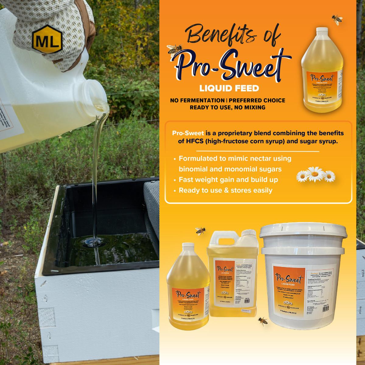 Pro-Sweet™ is a sugar syrup that is formulated to mimic nectar using disaccharide and monodisaccharide sugars. With the disaccharides acting like natural nectar and monodisaccharides acting like honey, it not only stimulates the bees but also helps add weight to the hive.